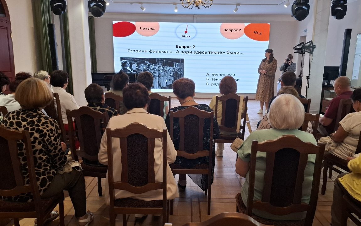 Перед началом акции гостям предложили сыграть в интеллектуальную игру «Война в кадре и за кадром». Четыре раунда по шесть вопросов, посвященных легендарным советским фильмам о войне. Фрагменты любимых кинолент, песни, ставшие народными, погрузили зрителей в атмосферу комфортного дружеского общения.