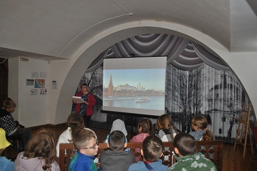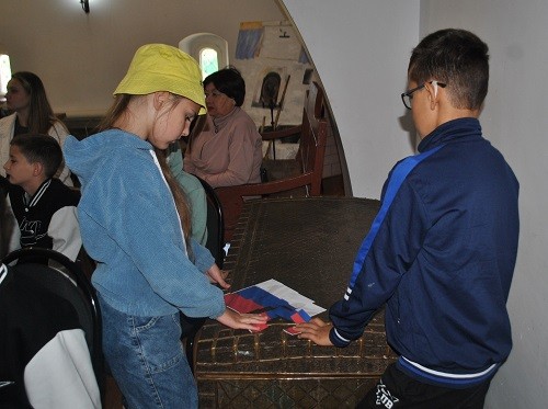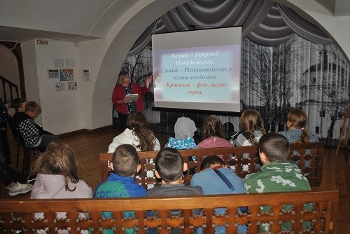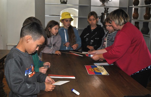 Сотрудники музея рассказали об истории Российского флага – официального символа государственной власти. Ребята узнали, что впервые бело-сине-красный флаг был поднят в царствование Алексея Михайловича на первом русском военном корабле «Орёл», построенном в 1667-1669 годах на Дединовской верфи. Законным же «отцом» триколора признан Петр I. 31 января 1705 года он издал Указ, согласно которому «на торговых всяких судах» должны поднимать бело-сине-красный флаг, сам начертал образец и определил порядок горизонтальных полос. Официальный статус флаг приобрел только в 1896 году, когда накануне коронации Николая II министерство юстиции определило, что национальным должен «окончательно считаться бело-сине-красный цвет, и никакой другой».