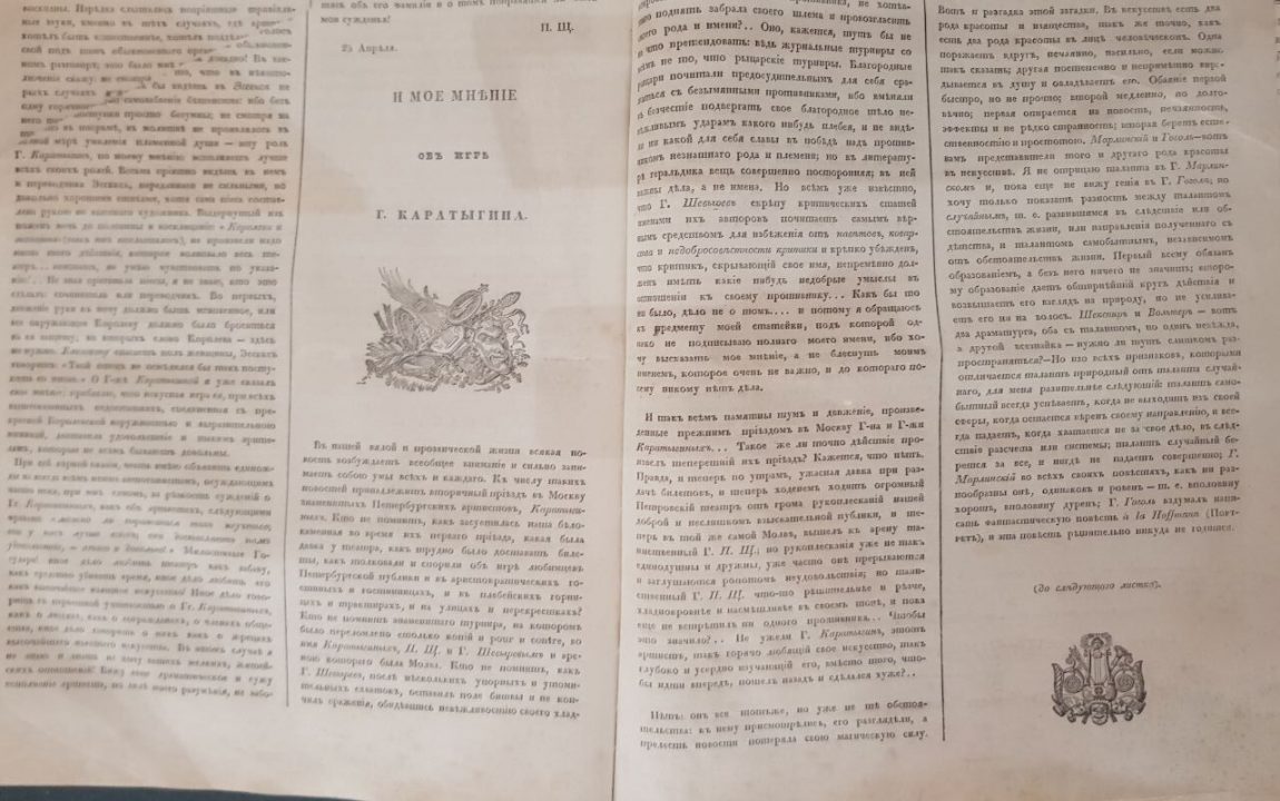 В 1835 г. в газете «Молва» была опубликована известная статья Белинского «И мое мнение об игре г. Каратыгина». Разбирая игру известного петербургского актера, критик выступил против искусственного пафоса и риторики за правду жизни и демократизм искусства.