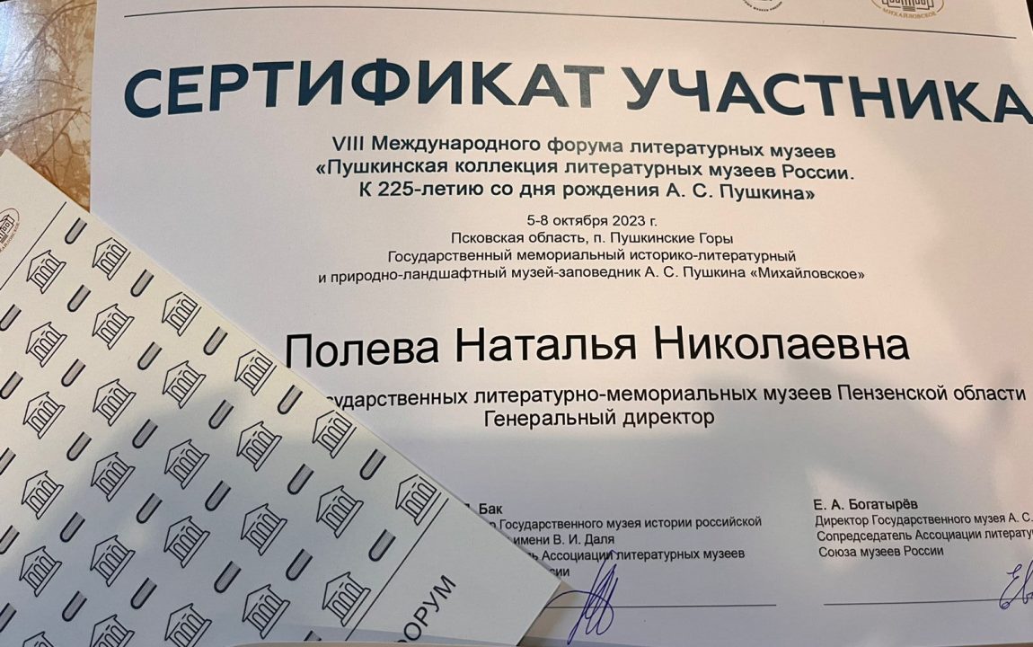 В числе руководителей и ведущих сотрудников государственных литературных музеев России в форуме приняла участие генеральный директор Объединения литературно-мемориальных музеев Пензенской области Наталья Полева. Напомним, Объединение является членом Ассоциации литературных музеев Союза музеев России.