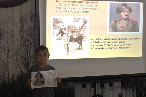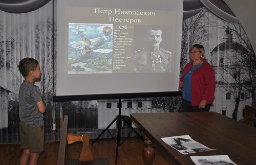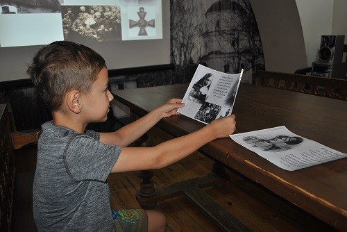 Сотрудники музея рассказали посетителям о главных сражениях войны, о героях Первой мировой: Римме Ивановой – сестре милосердия, единственной в России женщине, удостоенной ордена Святого Георгия 4-й степени. Награду девушка получила посмертно за подвиг, совершённый 9 сентября 1915 г. недалеко от белорусского города Гродно, у села Мокрая Дуброва. В роте, где Римма служила фельдшером, погиб командный состав. Сестра милосердия собрала вокруг себя всех, кто мог держать оружие, и повела в атаку. Бой был выигран. Участники узнали о ярчайшем примере мужества, стойкости и доблести русского солдата Петра Нестерова. Ценой своей жизни летчик, используя вид тарана «удар шасси по крылу», протаранил австро-венгерский шпионский самолёт Albatros, и Козьме Крючкове, который был первым, среди награждённых Георгиевским крестом. Казак в ходе кавалерийской схватки лично зарубил шашкой и заколол пикой 11 человек.