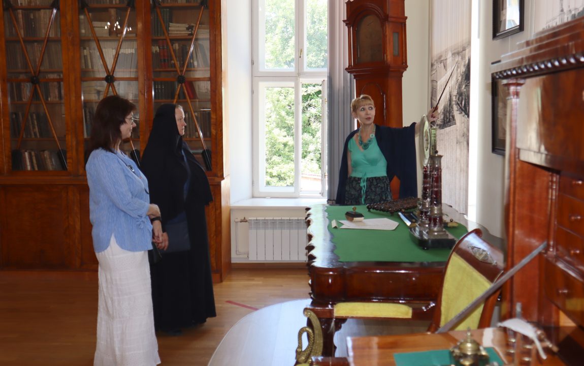 Настоятельница Троицкого женского монастыря г. Пензы — игуменья Александра (Макова) посетила Литературный музей 2 июля. Матушка ознакомилась в экспозицией музея и увлеченно прослушала рассказ экскурсовода о выдающихся русских литераторах, имеющих отношение к пензенскому краю. Визит представителя духовенства для пензенского Литературного музея — неординарное событие, поэтому нам захотелось запечатлеть момент для истории.