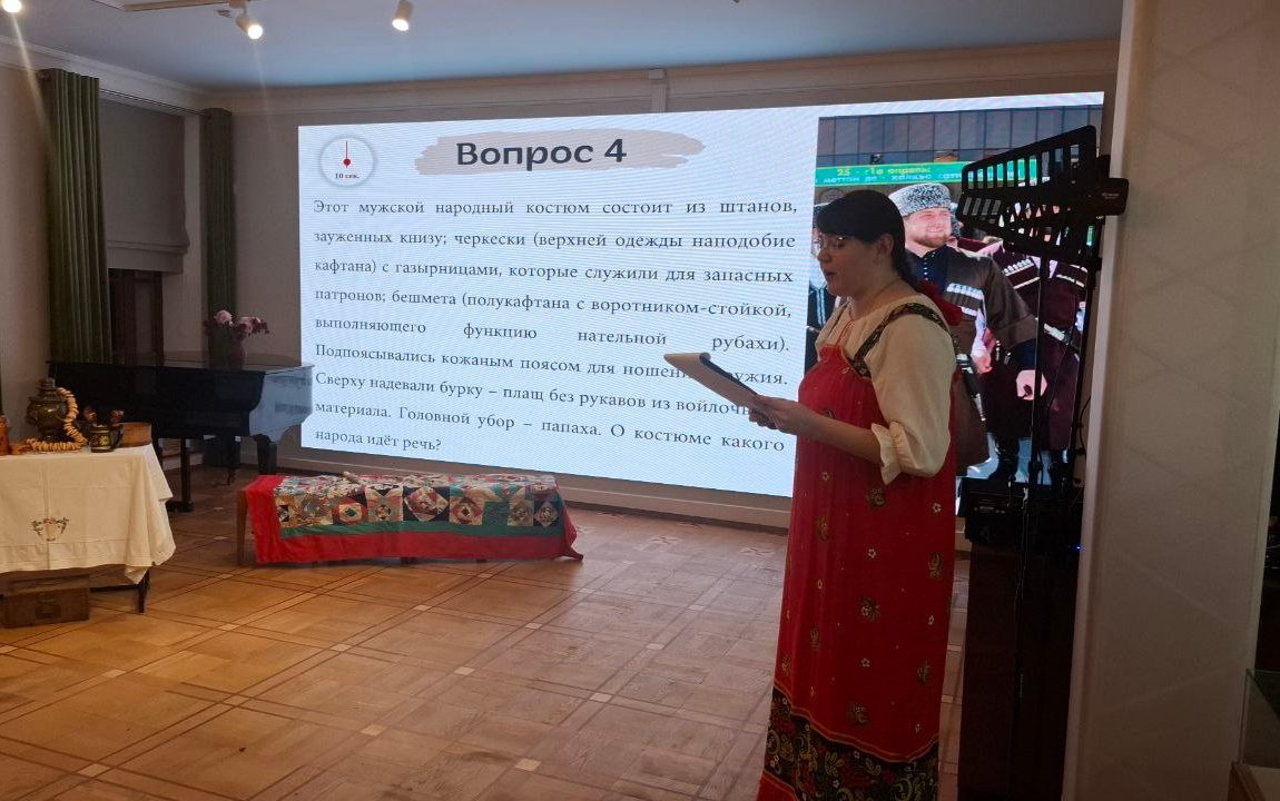 Викторина состояла из 4 этапов по 5 вопросов и суперигры. Были подготовлены вопросы о народных костюмах, промыслах, национальных блюдах и пословицах русских, татар, украинцев, белорусов, якутов, удмуртов, чеченцев, чукчей, армян, чувашей…