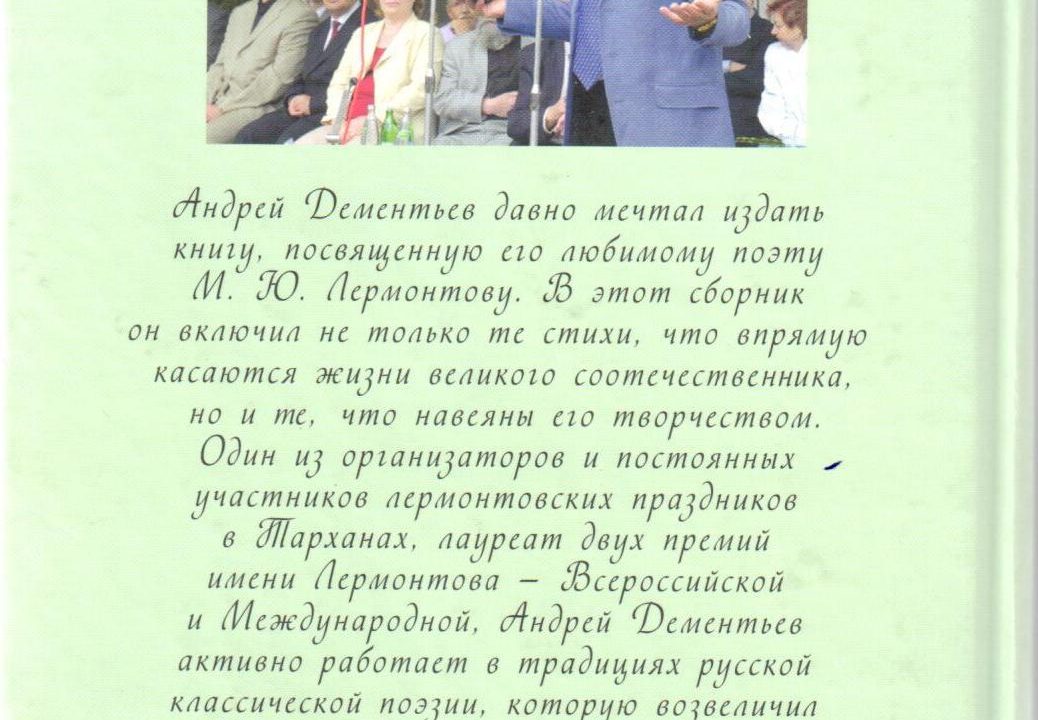 В предисловии книги, целиком посвящённой М.Ю.Лермонтову, А.Дементьев пишет: «Сколько себя помню, — я всегда был влюблён в стихи Михаила Юрьевича Лермонтова. Сначала мне читал вслух отец, присаживаясь на краешек кровати, когда мама укладывала меня спать. В свои четыре года я еще не знал грамоты, не умел складывать буквы, но очень любил слушать, как отец нараспев, завораживая меня небесной музыкой слова, колдовал надо мной: «Ночевала тучка золотая на груди утёса великана…» И я засыпал под это видение.