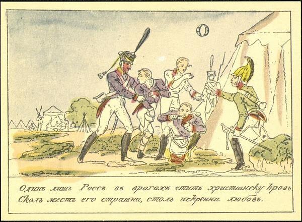 Теребёнев сумел найти форму выражения, понятную всем без исключения. Это «политическая карикатура», «летучие листки» – так их еще называли. Благодаря этим листкам жители России узнавали о многочисленных примерах героизма и самоотверженности: о старике, притворившемся глухим, чтобы не выдать французам, где скрываются его односельчане, укрывшиеся от врага в лесу (буква «А»); о старостихе Василисе, которая, командуя своим крестьянским войском, вооружённая лишь косой, брала в плен французов (буква «И-I»). Особенно трогателен эпизод, запечатленный на листе с буквой «О». Он напоминает о том, что и в жестоких испытаниях войны русские люди не забывали о доброте и человечности: возле палатки, у котла с пищей, двое русских солдат кормят трёх французов. Один из них уже ест, другой тянется за куском, третий благодарно целует в плечо русского солдата. Под листом полная достоинства надпись: «Один лишь Росс в врагах чтит кристианску кровь. Сколь месть его страшна, столь искренна любовь».