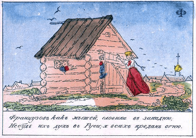 Один из самых известных сюжетов азбуки – «Русский Сцевола», где изображён крестьянин, готовящийся отсечь себе руку с поставленным французами клеймом «N» – «Наполеон». Текст под картинкой гласит: «Как чёрному царю на Руси не царить, Так имя на руке его мне не носить». Теребенёвская карикатура в данном случае иллюстрировала небольшую заметку, опубликованную в «Сыне Отечества»: «В армии Наполеона (как у нас на конских заводах) клеймят солдат, волею или неволею вступающих в его службу. Следуя сему обыкновению, французы наложили клеймо на руку одного крестьянина, попавшего к ним в руки. С удивлением спросил он, для чего его клеймили. Ему отвечали: «Это знак вступления в службу Наполеона». Крестьянин схватил из-за пояса топор и отсёк себе клеймёную руку. Нужно ли сказывать, что сей новый Сцевола был русский… Одна мысль служить орудием Наполеону или принадлежать к числу преступных исполнителей воли тирана подвигла его к сему геройскому поступку».