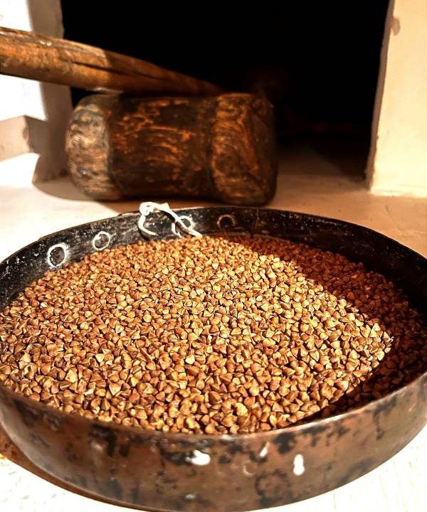 2 фунта (900 г) гречневой крупы ядрицы перебрать, просеять, поджарить на сковороде «до красна». Пересыпать в жаропрочной горшок «такого размера, чтобы около половины его оставалось свободным. Крупу, пока она ещё горяча, хорошо размешать с 0,5 фунта (225 г) чухонского (сливочного) масла и посолить, после чего влить кипятку настолько, чтобы каша была им еле покрыта, снова хорошо перемешать и поставить в горячую печь часа на 3».