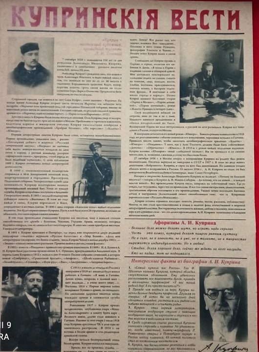 Экспозиция открывается книгами биографического и литературоведческого характера. Среди них материалы Всероссийской научно-практической конференции, посвящённой А.И. Куприну «Личность и творчество А.И. Куприна в контексте русской культуры XX-XI вв.», Путеводитель читателя с серией «Чтение в провинции» и Куприн в воспоминаниях, письмах, документах. Также представлены его произведения: лирика, эпиграммы и афоризмы, рассказы о животных, повести «Поединок», «Олеся», «Гранатовый браслет», которые давно вошли в школьные программы и сердца читателей.