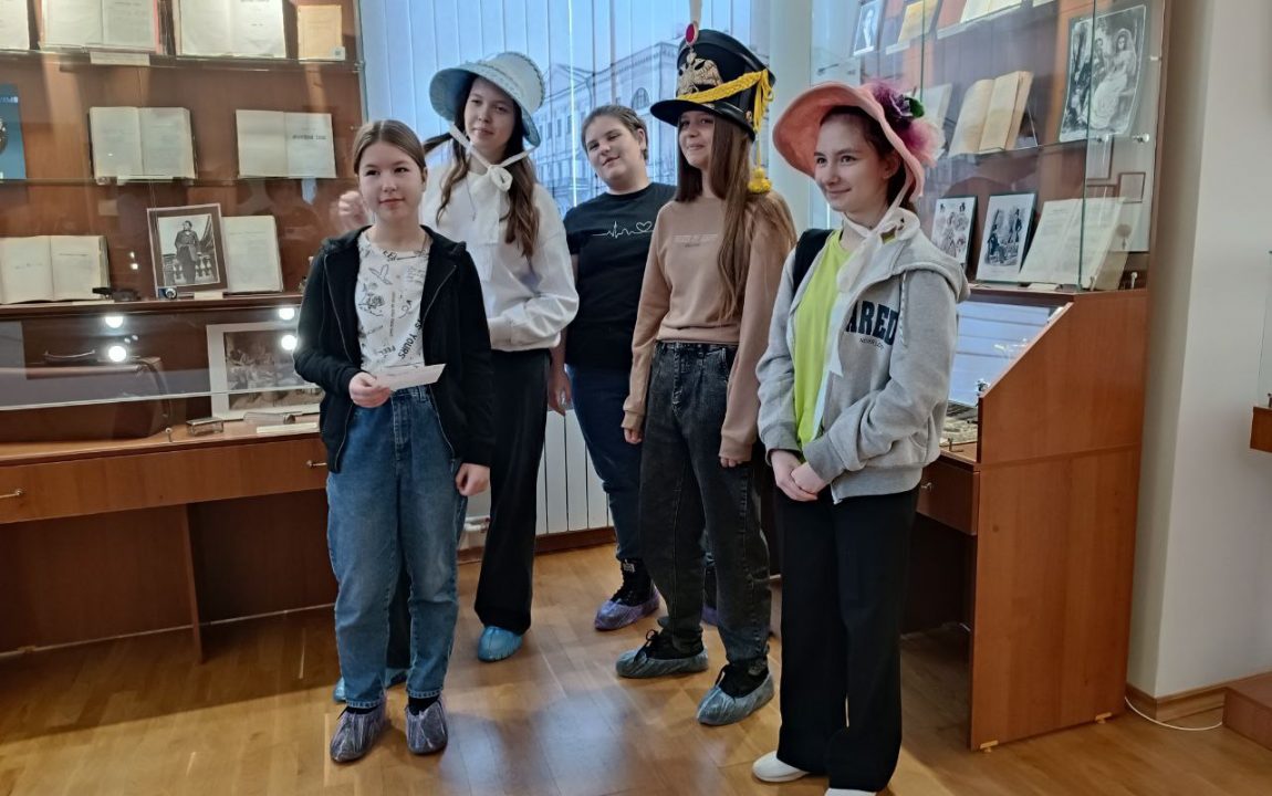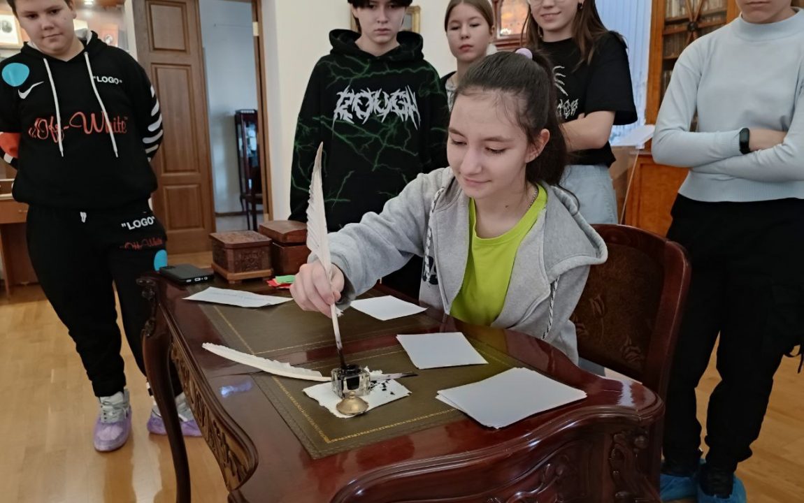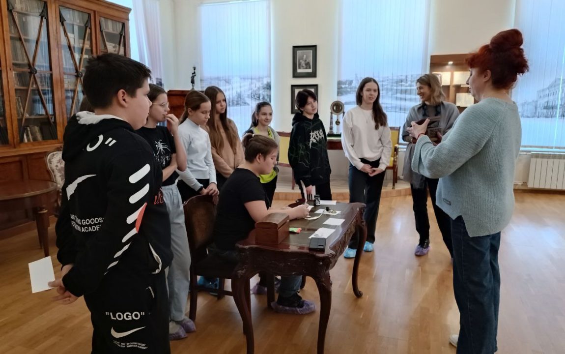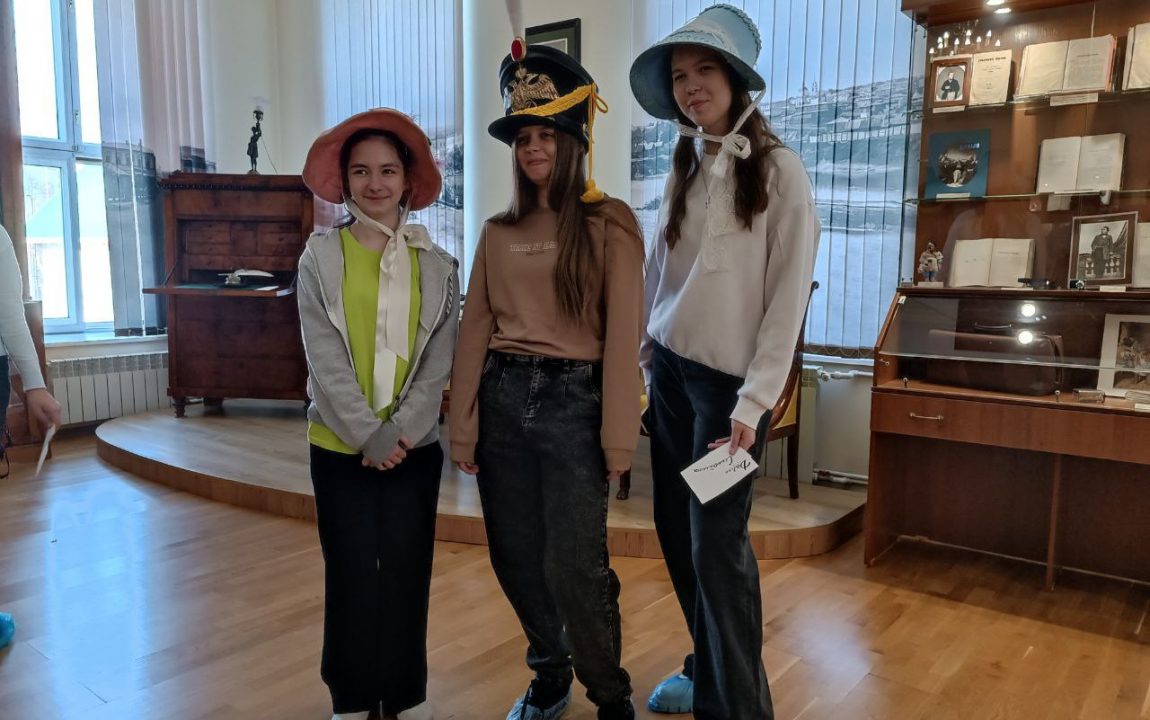 В завершение познавательной экскурсии школьники с интересом взялись за перо и чернила, чтобы вывести на бумаге свои имена, а также примерили кивер и шляпки. Ребята с интересом разгадали предложенные ребусы и попробовали играть в старинную игру 19 века – бирюльки.