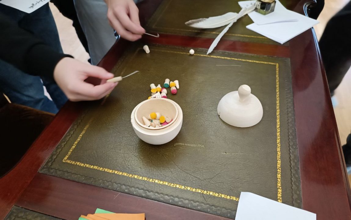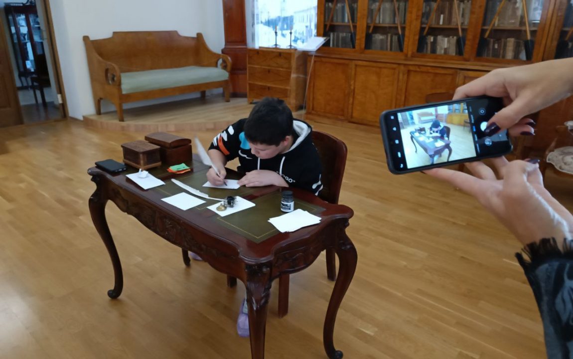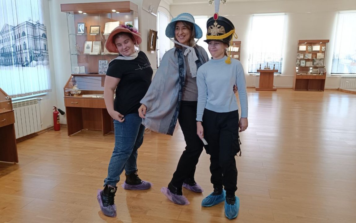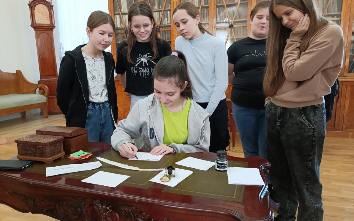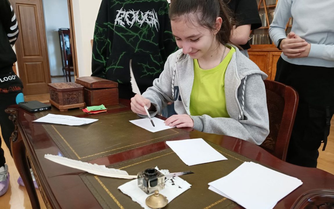 В завершение познавательной экскурсии школьники с интересом взялись за перо и чернила, чтобы вывести на бумаге свои имена, а также примерили кивер и шляпки. Ребята с интересом разгадали предложенные ребусы и попробовали играть в старинную игру 19 века – бирюльки.