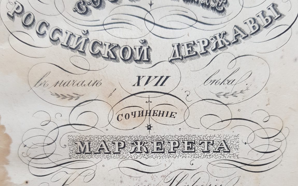 «Состояние Российской Державы в начале XVII века». Сочинения Маржерета, Капитана Гвардии Дмитрия Самозванца. [СПБ], [1830г.]. Нижняя часть титульного листа книги отсутствует.