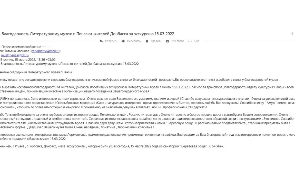 Хотим выразить искреннюю благодарность от жителей Донбасса, посетивших экскурсию в Литературный музей г.Пензы 15.03.2022. Спасибо за транспорт, благодарность отделу культуры г. Пензы и всем ответственным лицам, принимавшим участие в организации нашего посещения Вашего чудесного музея!