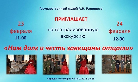 Уважаемые друзья, музей А.Н. Радищева приглашает на театрализованную экскурсию «Нам долг и честь завещаны отцами», посвящённую Дню защитника Отечества, в которой рассказывается о военных заслугах Радищевых.