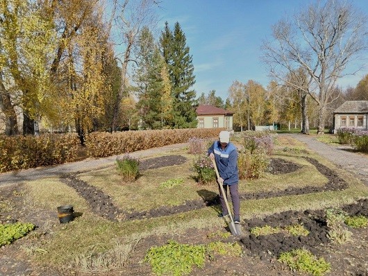 В течение месяца были убраны опавшие листья и сухие ветки, тщательно подметены дорожки. Особое внимание уделили цветочным клумбам – их подготовили к зимнему периоду. В заключительный день месячника коллектив музея, вооружившись граблями, навел порядок на территории около барского дома.