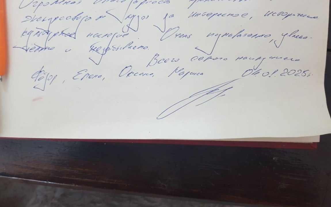 Интересные и душевные экскурсии, вдохновляют посетителей оставлять отзывы о музее: «Огромная благодарность хранителям и экскурсоводам музея за интересное, историческое культурное наследие. Очень познавательно, увлекательно и незабываемо. Всего самого наилучшего.Федор, Елена, Оксана, Марина.»
