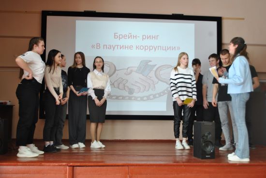 Школьники, разделившись на команды, посостязались в игре, состоявшей из двух туров «Эрудированный» и «Скоростной», на знание коррупции. Ребята рассматривали конкретные ситуации и анализировали, есть ли в них данное явление, рассуждали о причинах возникновения, объясняли смысл пословиц на данную тему.