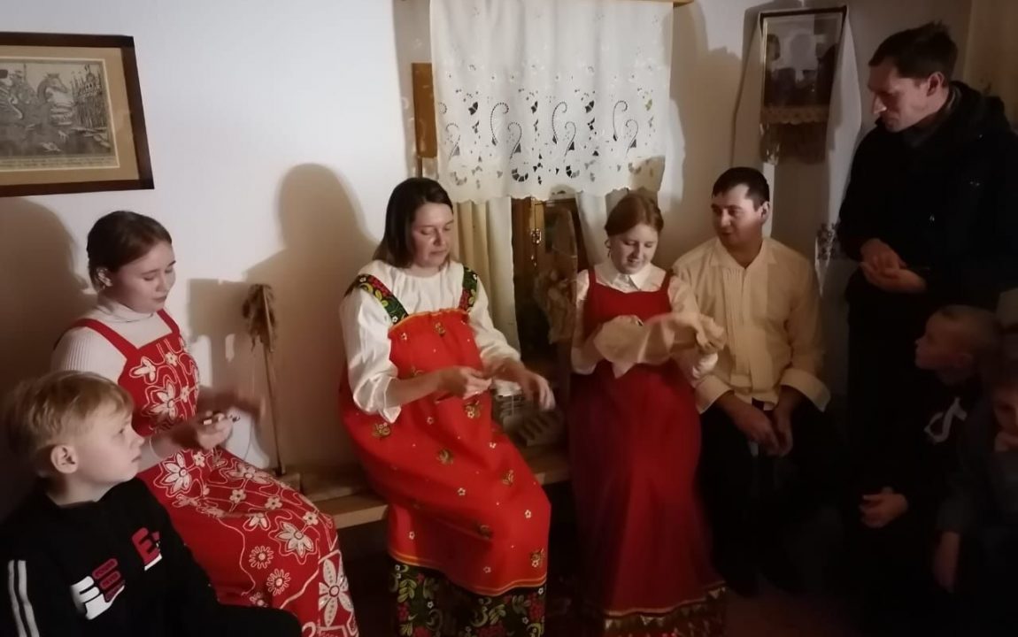 На Руси после сбора урожая наступало «сытое время». Старшие могли дома у печи беседовать, а молодёжь собиралась в избах на посиделки. Девушки и парни собрались на посиделки, чтобы гостей повеселить и себя показать!! Девушки брали с собой пряжу, вышивку или другое полезное дело. Работали, но не скучали! Сражались ли вы с помощью …скороговорок? А в веретёнышко играли? А «Редьку» тянули на кухне мемориального дома? — всё это можно было увидеть на «Ночи искусств» в фольклорной программе.
