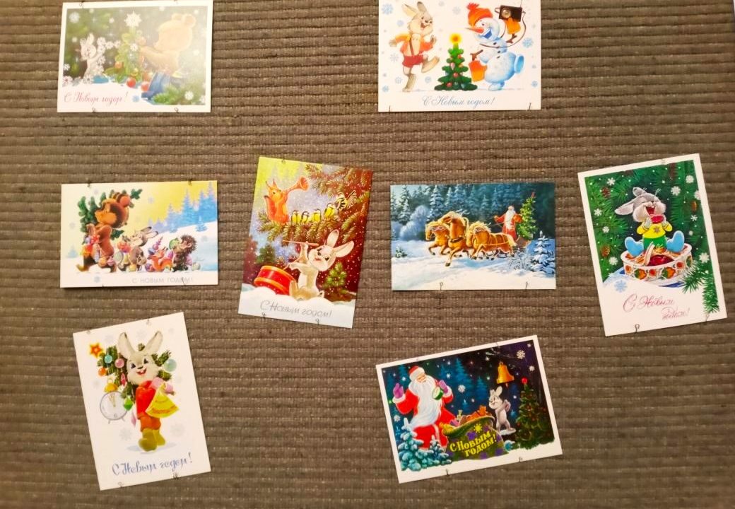 Вниманию посетителей музея представлены открытки советского времени. История советских новогодних открыток началась в 1935 году, когда вновь начали отмечать Новый Год и небольшие типографии стали печатать поздравительные карточки. Настоящий расцвет советских новогодних открыток произошел в 60-80 годы, прошлого века. Над ними работали художники, которые из-за моды на открытки быстро стали известными. Главные герои новогодних открыток Владимира Зарубина – обаятельные зайки, белочки, медвежата, ежата, которые быстро стали самыми популярными в стране. В коллекции российских открыток с 90-х годов прошлого века присутствует поздравление «С Рождеством!»