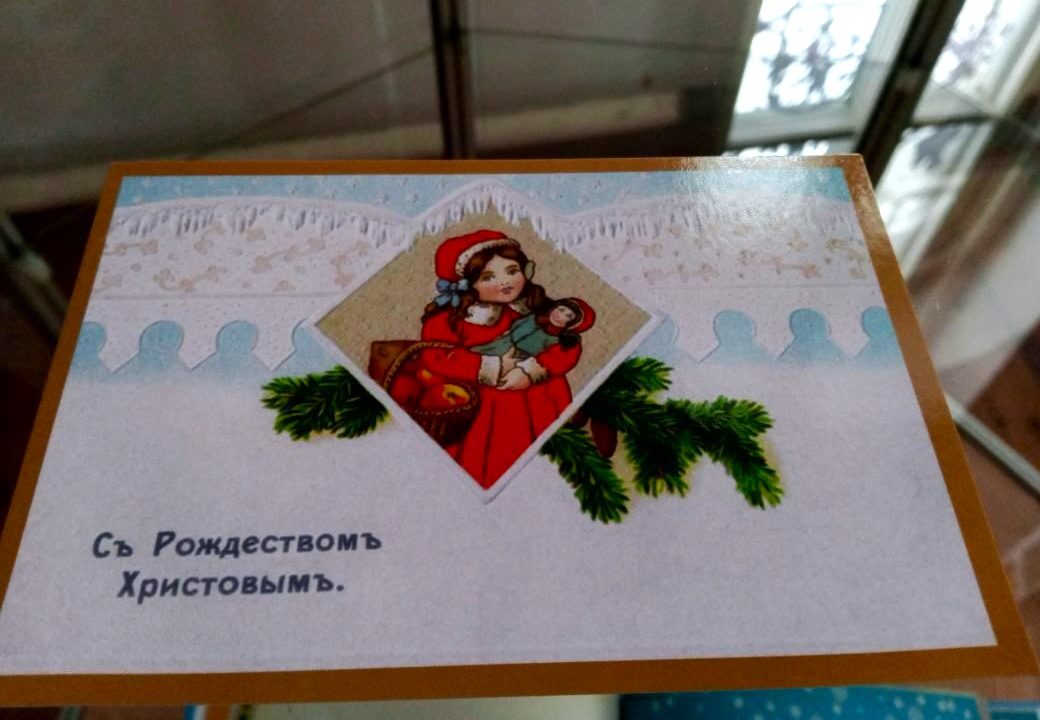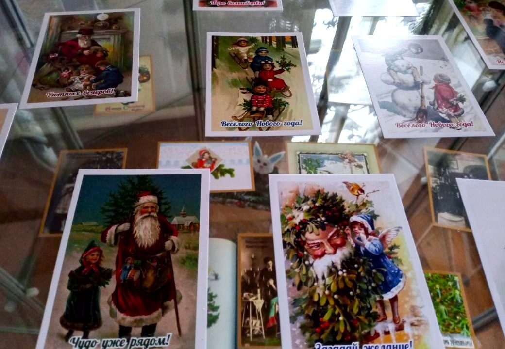 На выставке «Новогодние открытки из прошлого» экспонируются открытки разных эпох. Среди экспонатов музея можно видеть новогодние карточки дореволюционной России. На них изображены женщины и дети с цветами, олицетворяющие светлое будущее, которое непременно ждет в новом году.