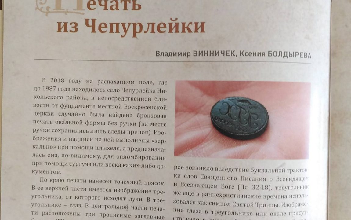 «В 2018 году на распаханном поле, на том месте, где до 1987 года находилось село Чепурлейка Никольского района, в непосредственной близости от фундамента местной Воскресенской церкви случайно была найдена бронзовая печать овальной формы без ручки. Изображения и надписи на ней выполнены зеркально при помощи штихеля, а предназначалась она, по-видимому, для опломбирования при помощи сургуча или воска каких-либо документов».