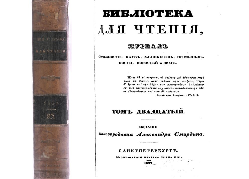 Журнал «Библиотека для чтения», 1837 г., том 23. На корешке: «Библиотека для чтения … Н.Алексеева». Кто же такой Н. Алексеев? Почему А.С. Пушкин назвал в своих поэтических текстах себя и Алексеева «Орест» и «Пилад»?