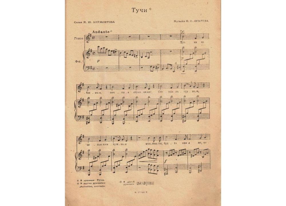 Несомненно, в творческой биографии Огарёва его музыкальные сочинения — лишь одна из многих и, конечно, не первостепенных страниц. Но каждая черта значительна и дорога нам в облике этого многогранного художника, которому было так свойственно «мира нового заветное исканье».