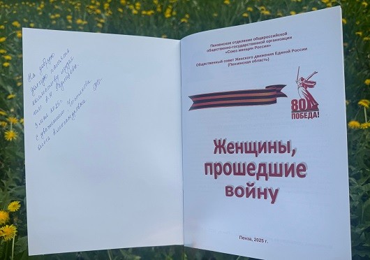 Ольга Александровна преподнесла в дар музею уникальную книгу «Женщины, прошедшие войну». Это издание особенно ценно в год 80-летия Победы. В нем собраны истории 33 женщин Пензенской области, чьи судьбы неразрывно связаны с военными годами. Их стойкость, труд и самоотверженность внесли важный вклад в общую Победу: они строили Сурский оборонительный рубеж, работали на заводах, помогали фронту, трудились в госпиталях и участвовали в боевых действиях. Эти истории напоминают о силе духа и вере в светлое будущее.
