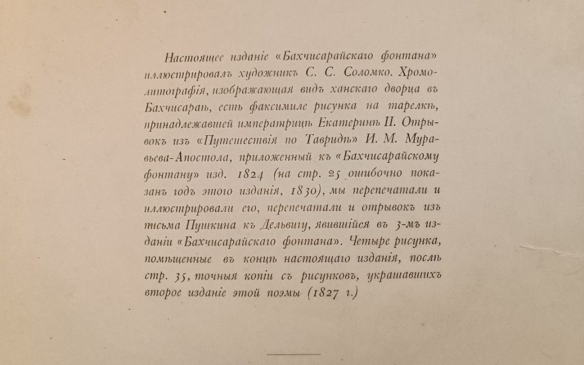 Также в книге помещены: хромолитография, изображающая вид ханского дворца в Бахчисарае (факсимиле рисунка на тарелке, принадлежавшей императрице Екатерине II); отрывок из «Путешествий по Тавриде» И.М. Муравьёва-Апостола, приложенный к «Бахчисарайскому фонтану» изд. 1824 г. (здесь он перепечатан и проиллюстрирован); отрывок из письма Пушкина А. Дельвигу, появившийся в 3-м издании «Бахчисарайского фонтана», а также четыре точные копии с рисунков, украшавших второе издание поэмы (1827г.).