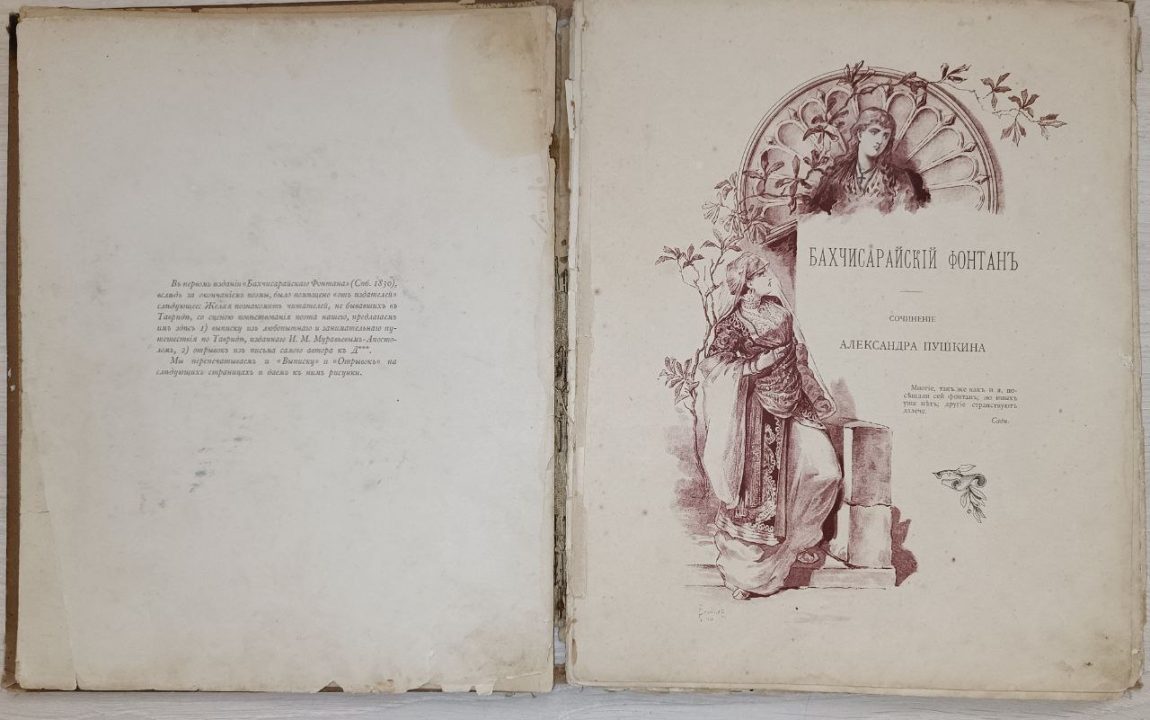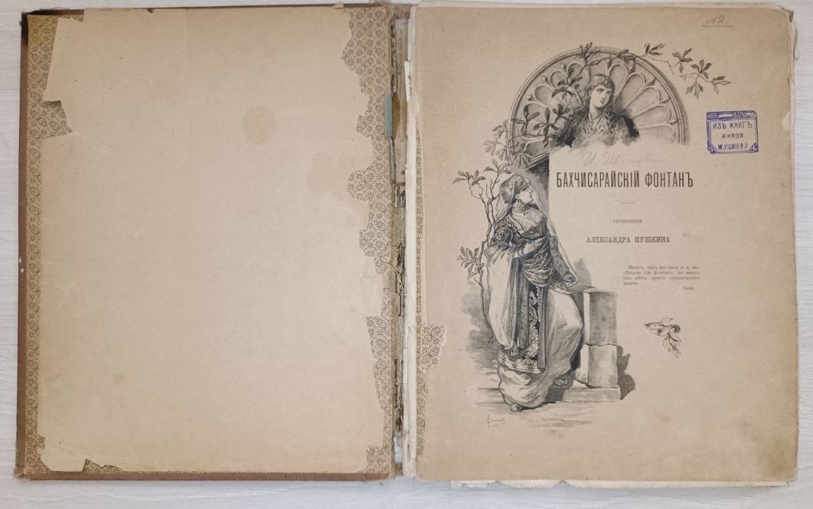 Замечательный подарок на днях преподнесла Пензенскому литературному музею Китаева Тамара Ашотовна. Она подарила издание поэмы «Бахчисарайский фонтан» А.С. Пушкина. Книга издана в типографии А.С. Суворина в 1892 году и является связующим звеном между предыдущими изданиями этой романтической поэмы А.С. Пушкина.