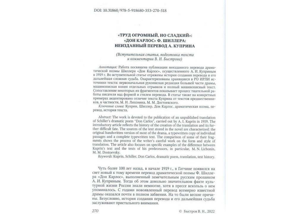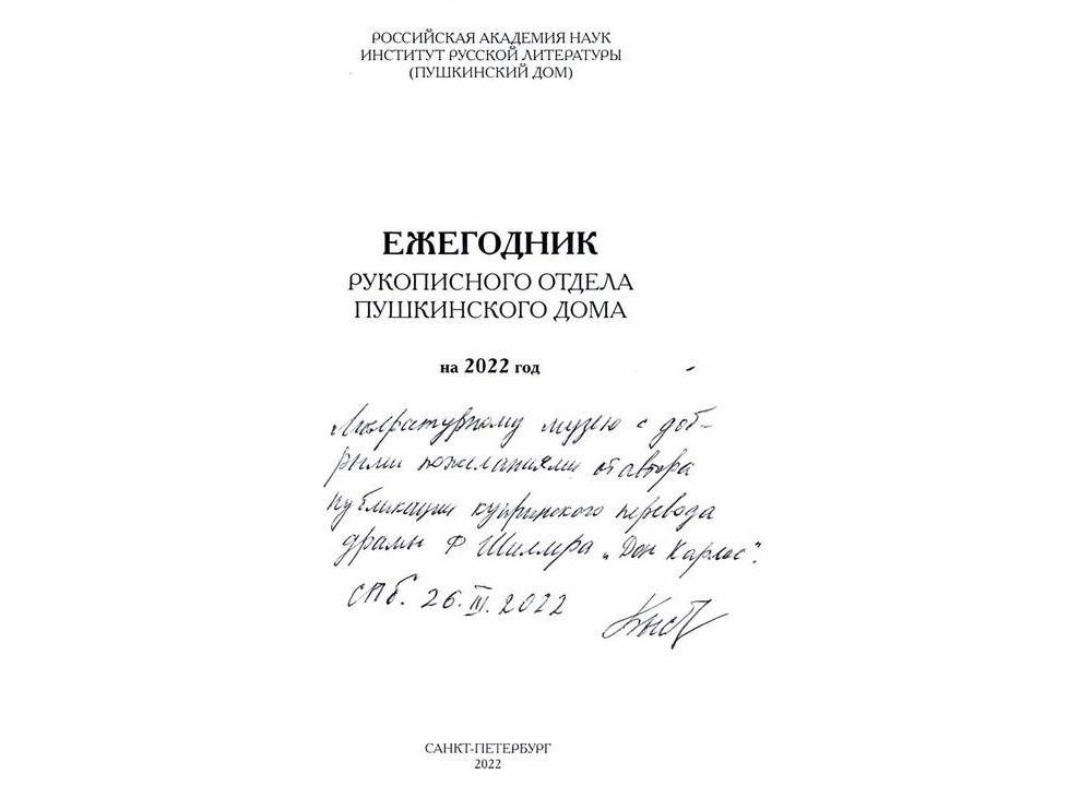 Для специалистов музея самой ценной публикацией в сборнике является неизданный перевод А.И.Куприна драмы Ф.Шиллера «Дон Карлос»(1919). Вступительную статью и комментарии к нему подготовил В.Н.Быстров (см. автограф на фото). Во вступительной статье отражены история создания перевода и его дальнейшая сложная судьба. Охарактеризованы хранящиеся в РО ИРЛИ источники текста: первоначальная рукописная редакция большей части драмы, машинописная копия отдельных отрывков и полный машинописный текст. В статье также на конкретных примерах акцентировано отличие текста Куприна от текстов предшественников, в частности, М.Н.Лихонина, М.М.Достоевского.
