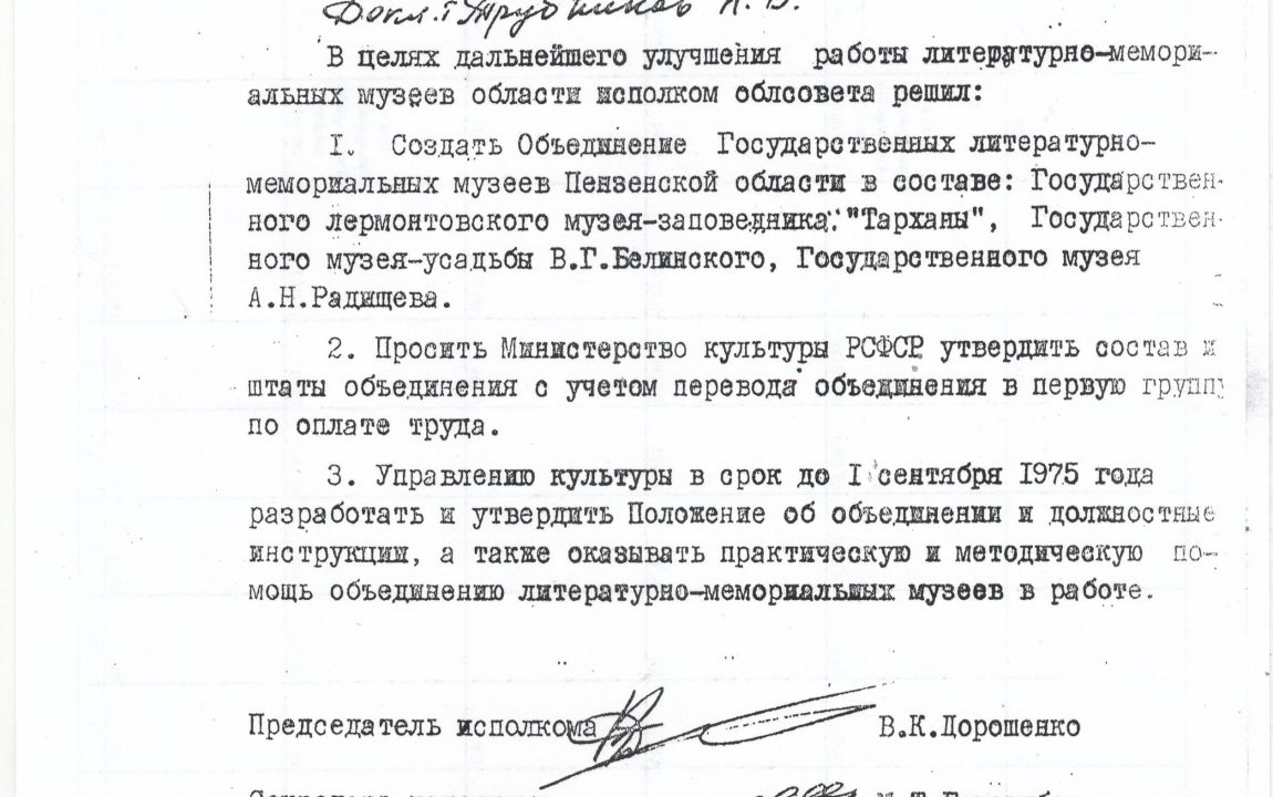 1975г. Решением исполнительного комитета Пензенского областного Совета депутатов трудящихся за №17-7 от 27.08.1975 создано Объединение государственных литературно-мемориальных музеев Пензенской области в составе: государственного Лермонтовского музея-заповедника «Тарханы», государственного музея-усадьбы В.Г.Белинского и государственного музея А.Н.Радищева.