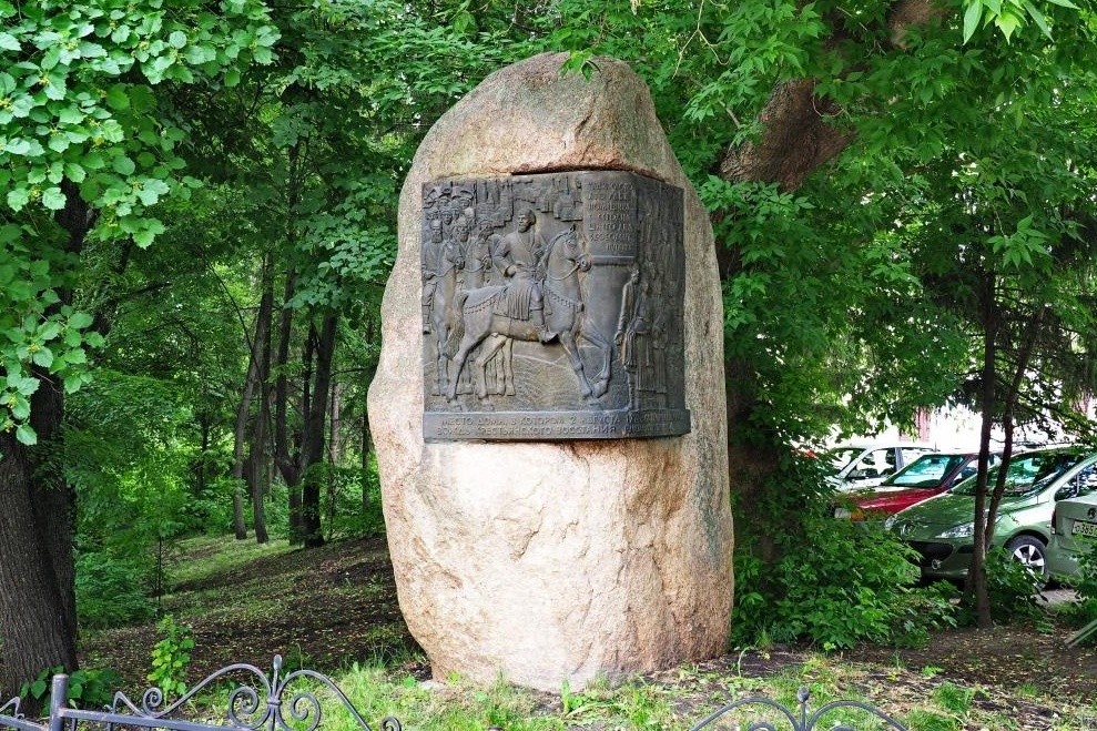 Фото 1: памятный камень (1982г.) Емельяна Пугачева на углу улиц Московской и Карла Маркса. Этот камень установлен на месте дома купца А.Я. Кознова. Над его созданием трудился коллектив скульпторов — Э.С. Иодынис и Л.Н. Скоробогатова.