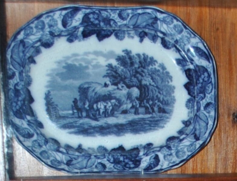 Сюжетный рисунок блюда для пирога “Укладывание крестьянами сена в омёт» выполнен в тревожных сине-фиолетовых тонах. Завитки по краю тарелки добавляют ощущение ветра и надвинающейся бури, тревогу крестьян.
