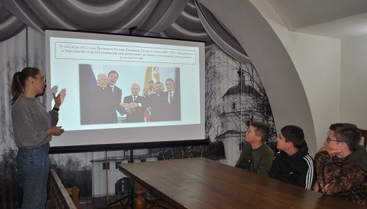 В этот памятный день в музее А.Н. Радищева состоялся информационный час «Мы вместе». Посетители музея вспомнили ключевые исторические события, произошедшие в 2022 году, и узнали о сложном пути, который прошли жители регионов. В ходе викторины ребята открыли для себя увлекательные факты о богатом историческом наследии Донбасса, проникаясь его уникальной культурой и самобытностью.
