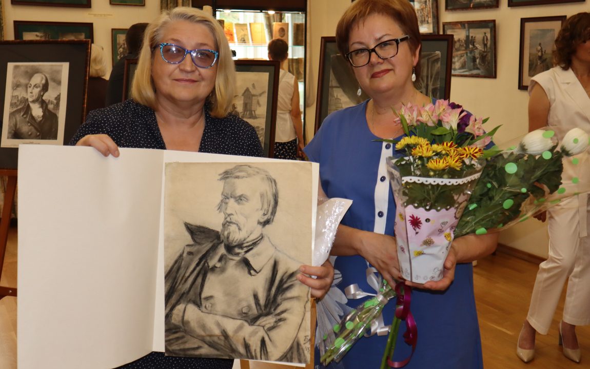 На презентации Татьяна Васильева преподнесла в дар Литературному музею несколько работ отца — портрет Белинского, выполненный карандашом, и три пастельных рисунка к произведениям Лермонтова.