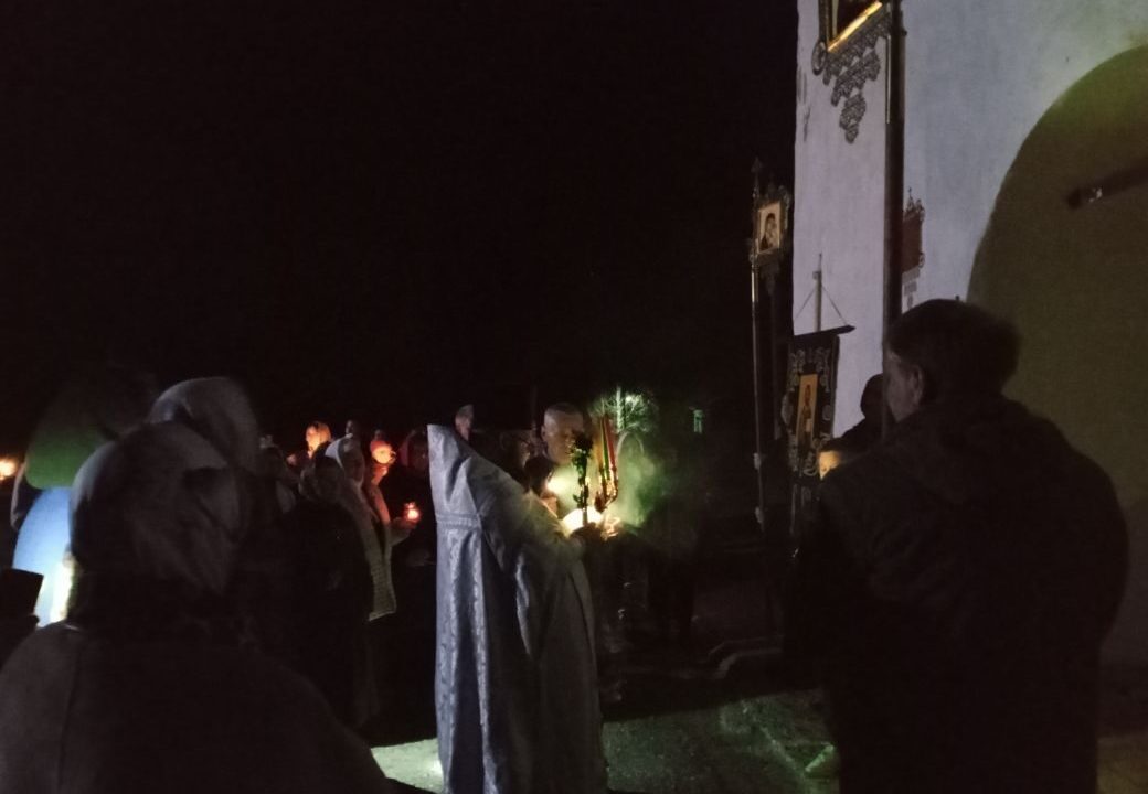 Во время богослужения верующие прошли крестным ходом с горящими в руках свечами. Все желающие по традиции освятили яйца и куличи.