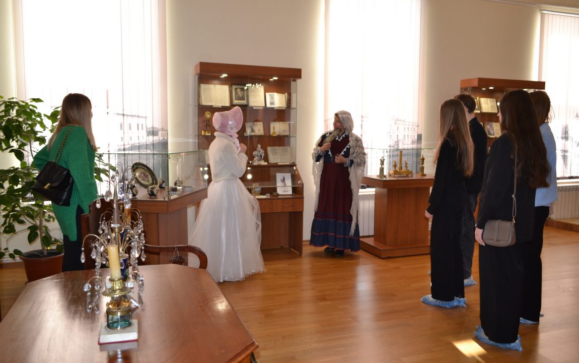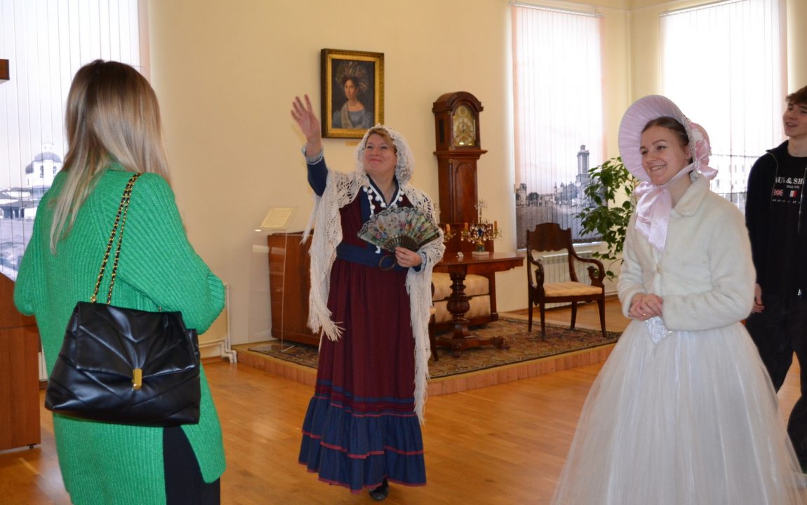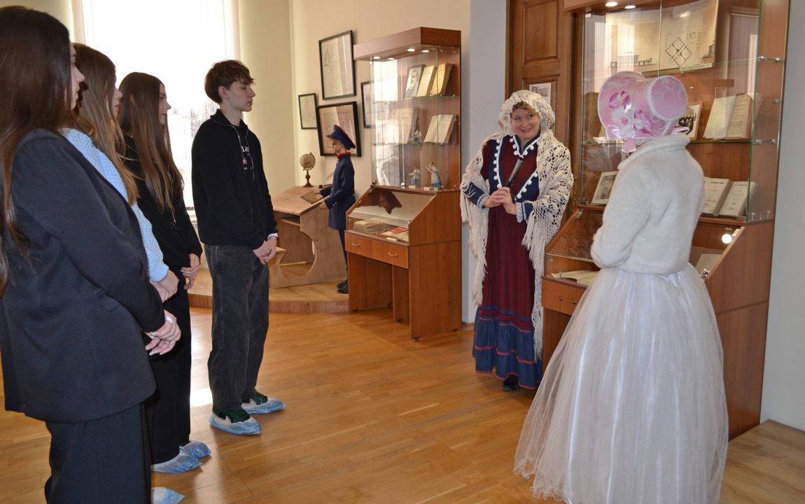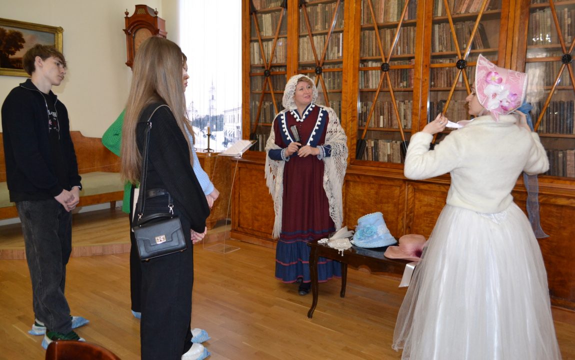Барышни проводят гостей музея по экспозиции «Пензенская земля – русской литературе» и расскажут о великих писателях и поэтах Пензенского края. Пензенские студенты узнали о И.И. Лажечникове, несколько лет возглавлявшем мужскую гимназию в начале XIX века; о театральном и литературном критике В.Г. Белинском, некогда учившемся в этих стенах. Они ознакомились с главным богатством музея – уникальным собранием прижизненных изданий авторов трех столетий: И.А. Крылова, Г.Р. Державина, Д.В. Давыдова, М.Е. Салтыкова-Щедрина, Н.С. Лескова и др.