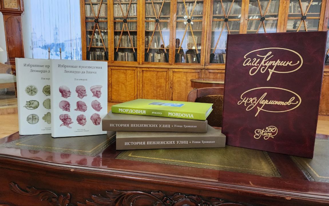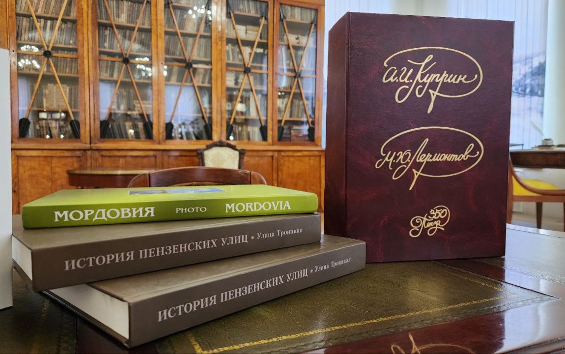 Среди переданных книг – сборник топонимики Пензы – это первая книга, посвященная истории городских усадеб Пензы, располагающихся по улице Троицкой (ныне Кирова). Особую ценность представляет редкий экземпляр произведений М.Ю. Лермонтова и А.И. Куприна, изданный в подарочном формате к 350-летнему юбилею города Пензы.