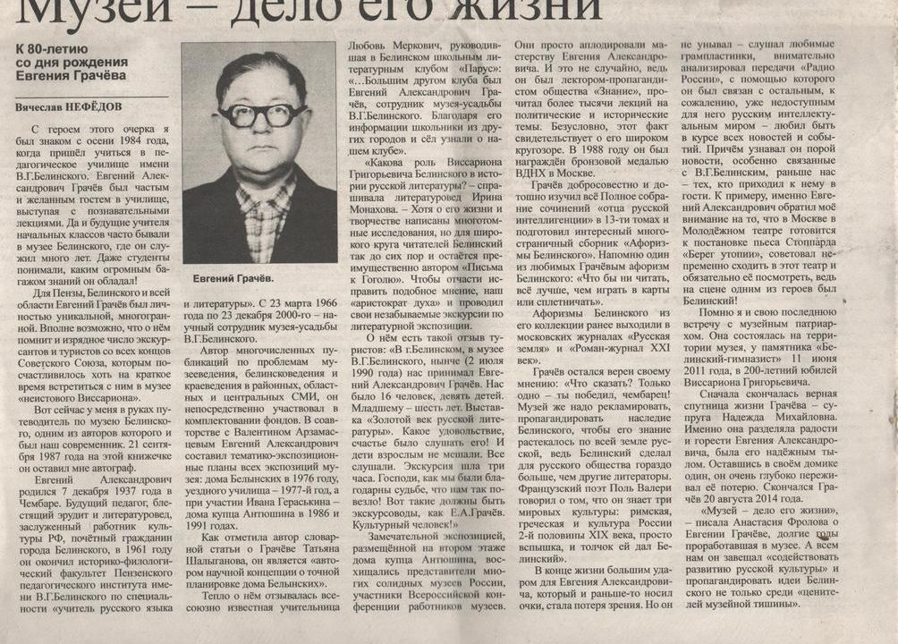 Справочно: Грачев Евгений Александрович — педагог, литературовед, Заслуженный работник культуры РФ. С 1966 г. по 2000 г. – научный сотрудник музея-усадьбы В.Г. Белинского. Автор публикаций по вопросам музееведения, белинсковедения, краеведения в районной, областной, центральной печати. Автор путеводителя «Государственный музей-усадьба В.Г. Белинского» (Саратов, 1979 г. и 1985 г. – второе издание, в соавторстве с В.П. Арзамасцевым). Участвовал в комплектовании фондов музея-усадьбы В.Г. Белинского. В соавторстве с В.П. Арзамасцевым составил тематико-экспозиционные планы всех экспозиций музея: «Семья Белинских» (мемориальный дом Белынских) – 1976, «Юность неистового Виссариона» (Чембарское уездное училище) – 1977, «Я в мире боец» (дом купца Антюшина) – 1986 и 1991 гг. Автор научной концепции о точной планировке дома Белынских. Лектор -пропагандист общества «Знание» (прочитал более 1000 лекций на политические и исторические темы).