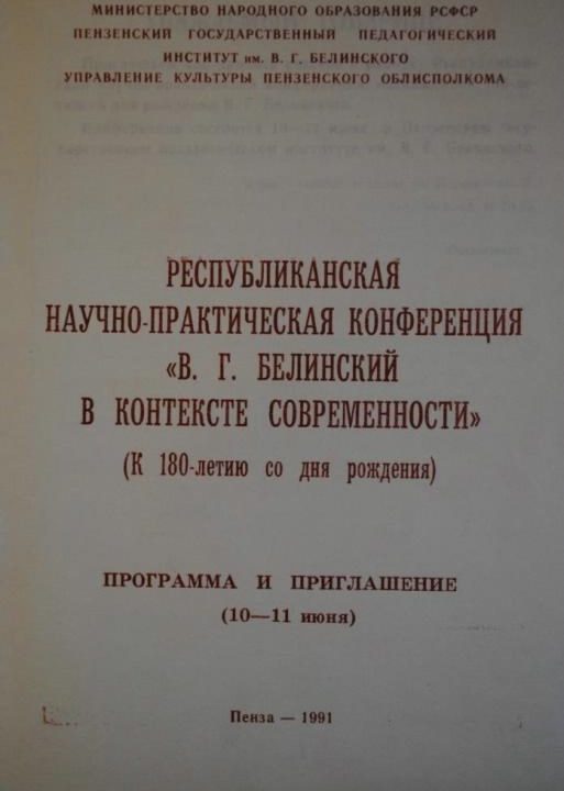 Проведена республиканская научно-практическая конференция «В.Г. Белинский в контексте современности» (к 180-летию со дня рождения критика), с участием учёных и специалистов ИМЛИ АН СССР, Тверского, Ижевского, Казанского, Воронежского университетов, ПГПИ имени В.Г. Белинского, Самарского, Череповецкого, Воронежского, Тульского,Кемеровсколго, Липецкого институтов, ЛГПУ имени А.И. Герцена, Объединения литературно-мемориальных предметов.