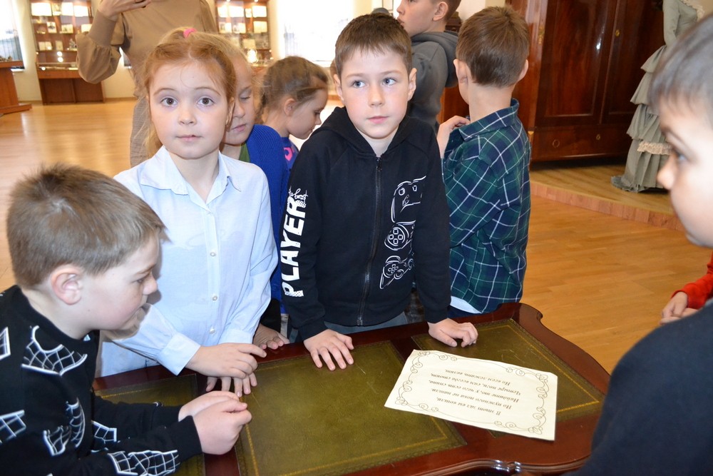 На экспозиции «Пензенская земля – русской литературе» также представлены произведения И.А. Крылова, со дня рождения которого в 2024 году исполнилось 255 лет. Здесь ребята обнаружили Стрекозу, потерявшую свою книгу, и, следуя по карте, помогли ей «вернуться домой». На пути их ждали ребусы и загадки, но школьники с блеском прошли все испытания, а в завершение квеста посмотрели мультфильм «Стрекоза и Муравей» по одноименной басне Крылова.