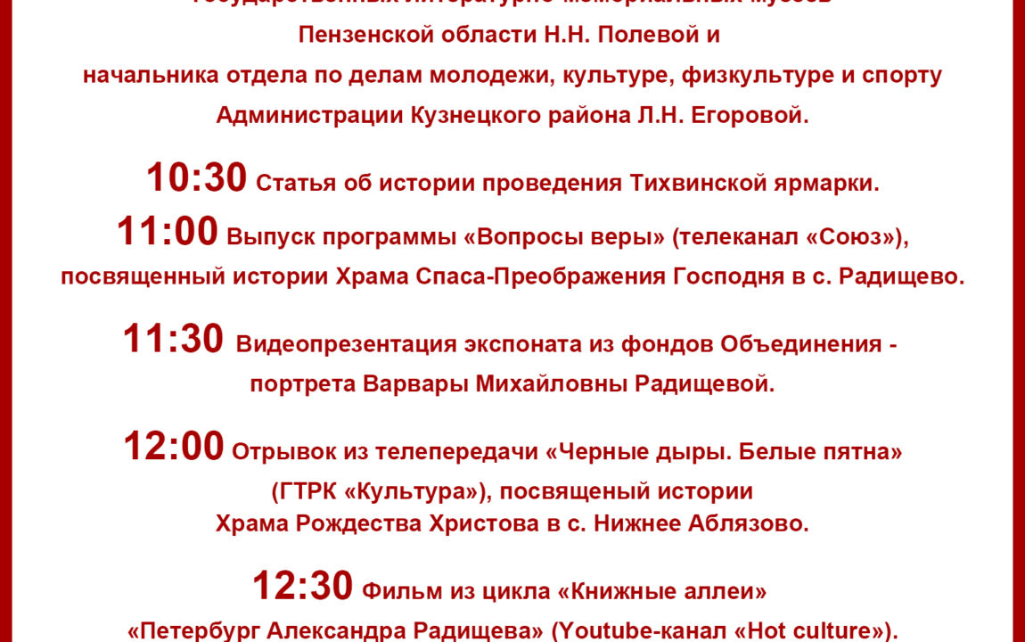 Подписчики виртуально отправятся в село Радищево и село Нижнее Аблязово, где увидят прекрасные памятники культуры и истории — старейшие храмы, появившиеся на пензенской земле благодаря предку «русского Вольтера» Александра Радищева, услышат рассказ об интереснейшем экспонате Литературного музея — портрете жены брата А.Н.Радищева — В.М. Радищевой (урожденной Чегодаевой), посетят Петербург и там пройдут по дорогам писателя-земляка, а потом вернутся в село Радищево, чтобы посмотреть концерт Заслуженного артиста России Валерия Семина, который украсил Тихвинскую ярмарку-2019.