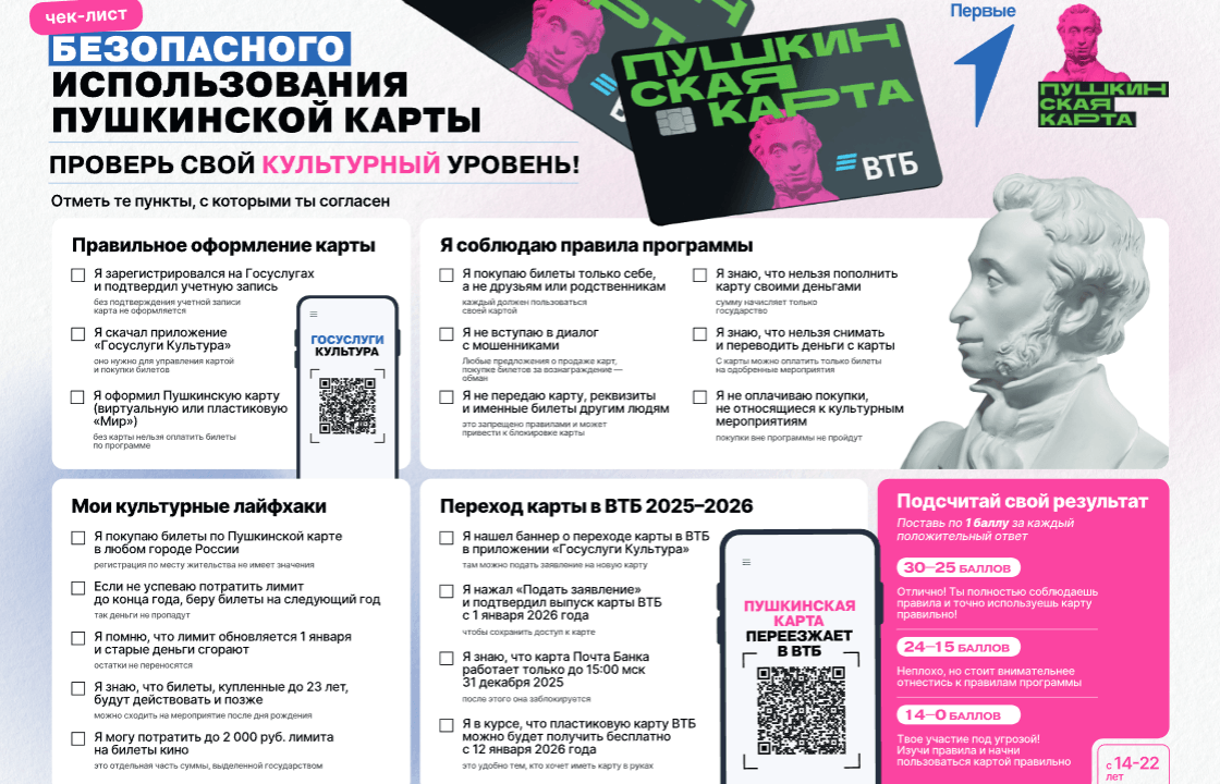 Общероссийское общественно-государственное движение детей и молодежи «Движение первых» подготовило памятку по безопасному использованию карты программы «Пушкинская карта». В чек-лист вошли пункты самопроверки, которые помогут пользователям подробнее ознакомиться с правилами.