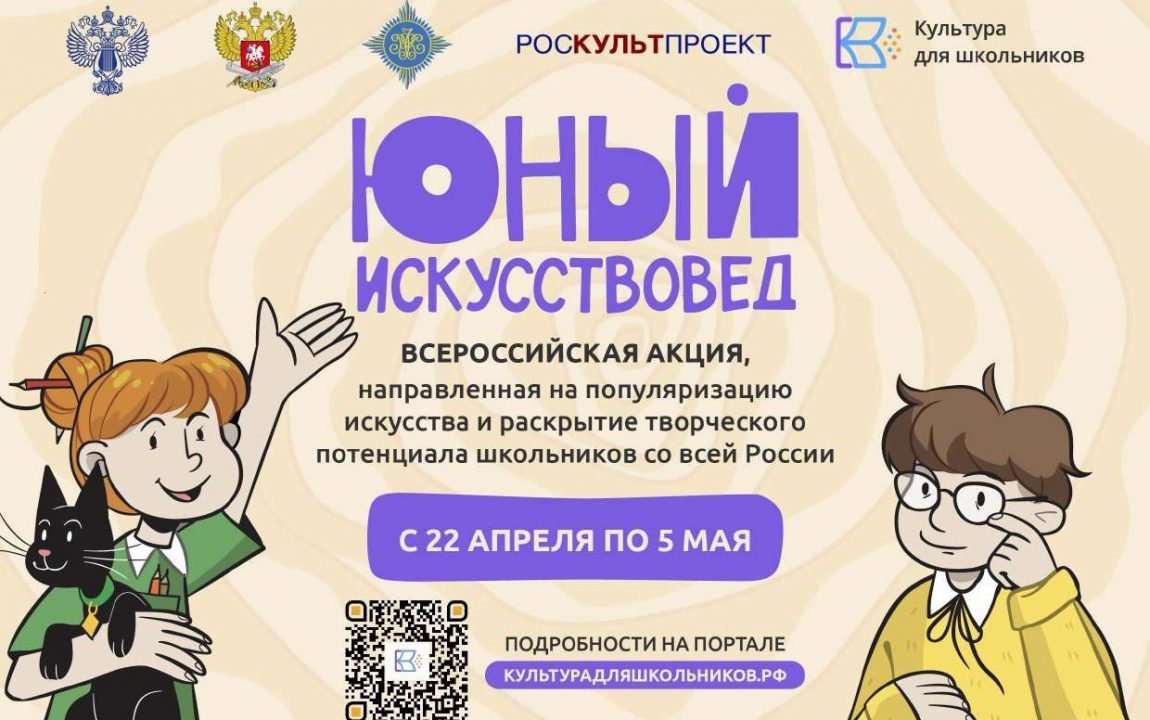 С 22 апреля по 5 мая 2024 года в рамках межведомственного культурно-образовательного проекта «Культура для школьников» пройдет Всероссийская акция «Юный искусствовед», направленная на популяризацию искусства и раскрытие творческого потенциала школьников.