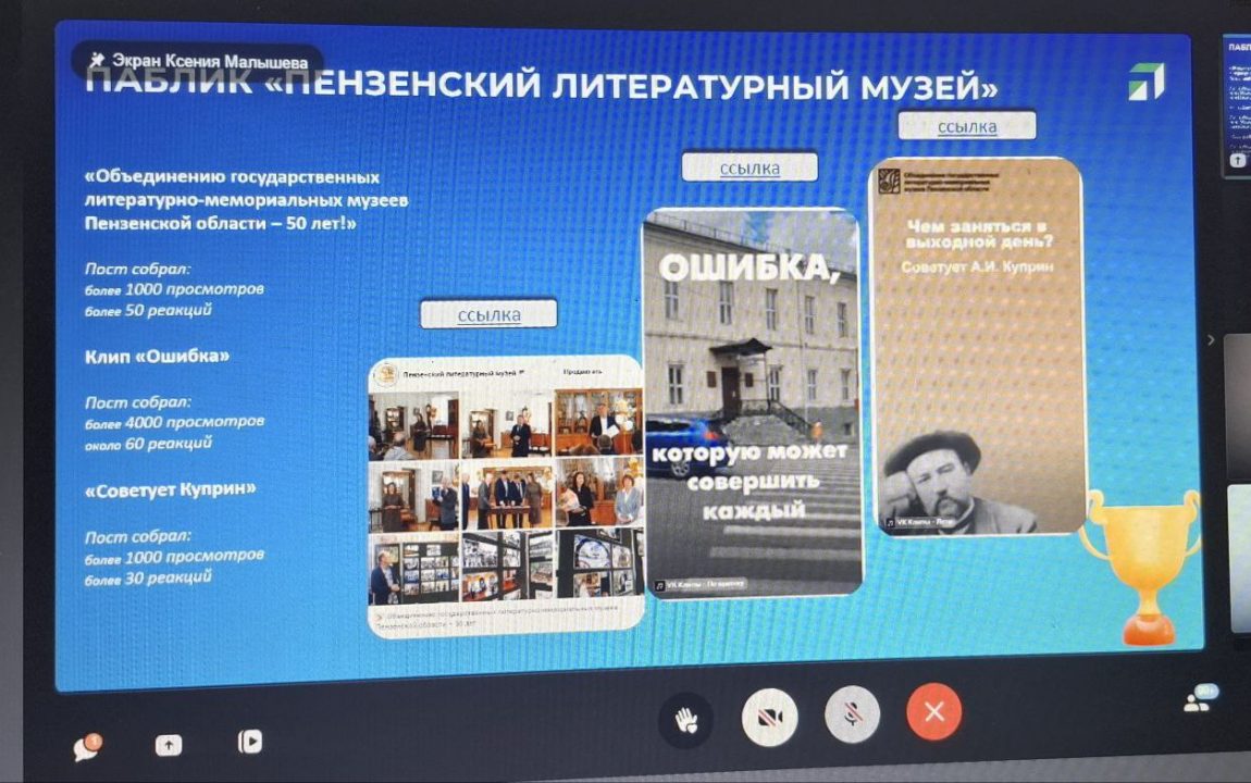 Специалист по связям с общественностью Объединения литературно-мемориальных музеев Пензенской области Ульяна Дадаева приняла участие в образовательном семинаре «Лучшие практики госпабликов Пензенской области». Он прошел в формате видеоконференцсвязи и объединил представителей разных сфер – культуры, образования, здравоохранения, транспорта, а также администраций районов Пензенской области.