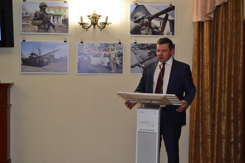 Ввиду того, что автор фотосерии служит в зоне СВО, фотовыставку «Донбасс – 2022» представил директор Средне-волжского филиала «Российской газеты» Арсений Бабенков: «Здесь представлены кадры начала специальной военной операции. Мариуполь, Волоноваха, Лисичанск – там, где мы приобретали первый боевой опыт, учились жить, выживать и наступать. Каждый кадр здесь не жестокий, но тяжелый. Здесь вся тяжесть простых людей и непростые условия наших бойцов, которые находятся на передовой и в тылу». Он добавил, что у военкора есть только один шанс на снимок.