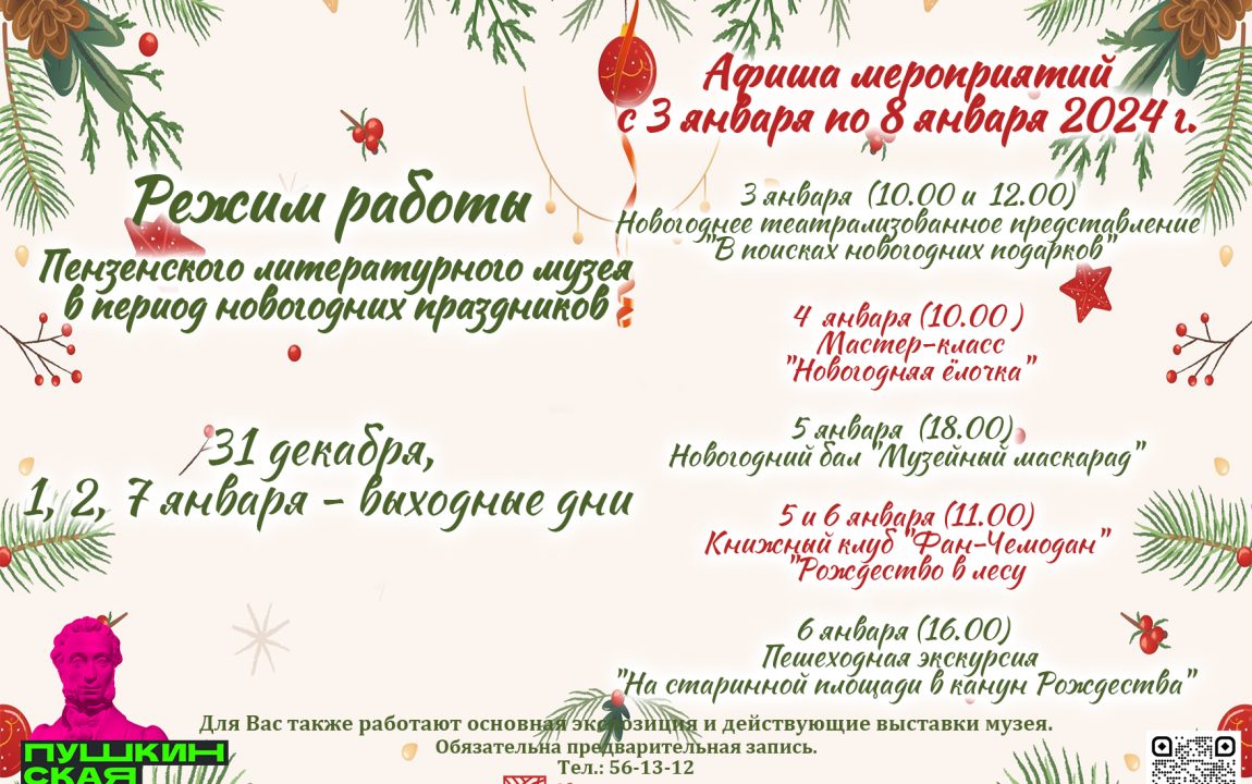 Режим работы Пензенского литературного музея в период новогодних и рождественских каникул: 31 декабря, 1, 2, 7 января — выходные дни.
