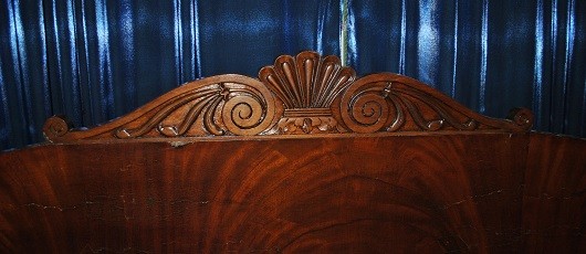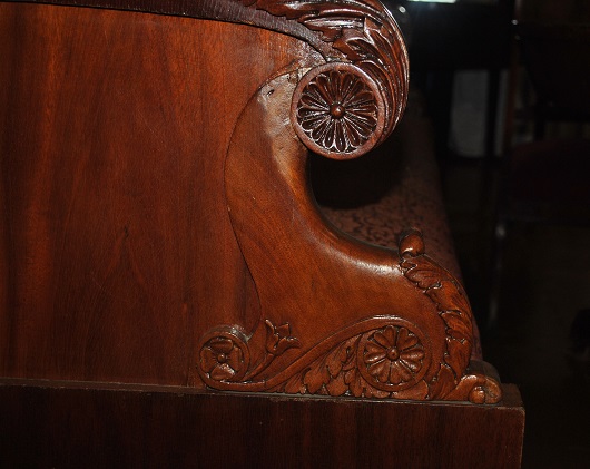 Замысловатый рисунок переплетающихся завитков с плавными переливами от контрастных темных до мягких светлых тонов напоминают языки пылающего огня. Шпон красного дерева с текстурой «пламя» довольно редкий материал, и мебель подобного образца можно назвать сегодня поистине уникальной. Спинка жёсткая, сплошная, деревянная, двояко выгнутая. Верх спинки и волюты локотников резные. Мягкое сидение с обивкой в спокойных тонах. Отличительной особенностью данной мебели 20-30-х гг. 19 века является искривленная форма подлокотников с утолщенным фигурным завитком на конце, а также спинка фигурная, которая визуально делит диван на три секции, но изготовлена из единого массива. Спинка и боковые части дивана «глухие». Спинка, локотники украшены резным элементом в виде цепочки из спиралевидных завитков с «глазком» (кружком) в центре – волют; лепестковыми розетками, дополненные резным растительным орнаментом.