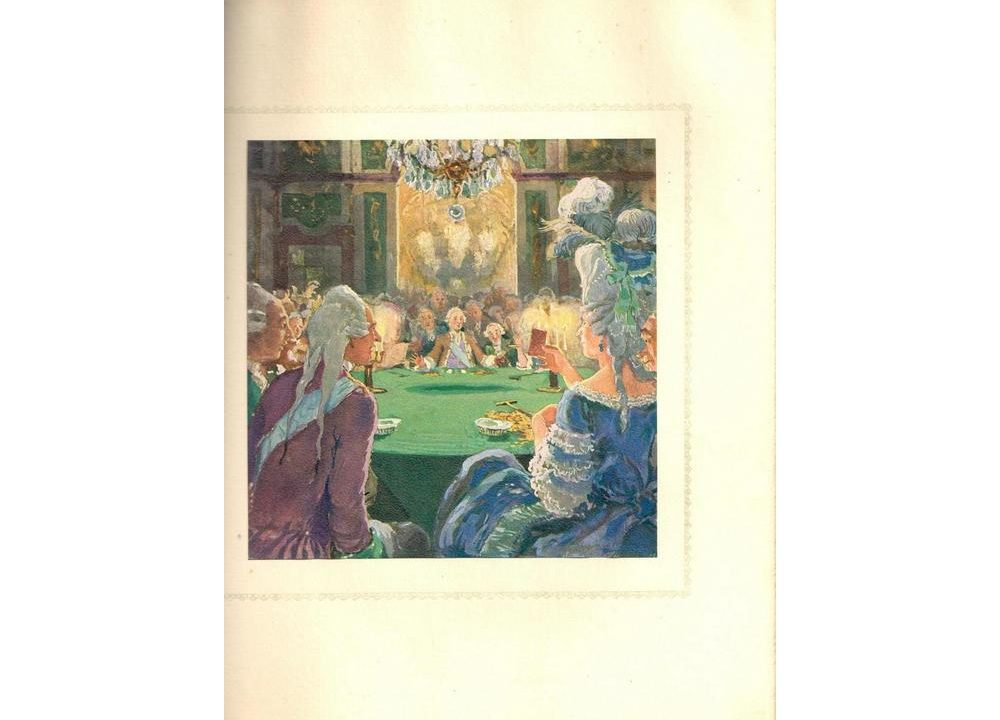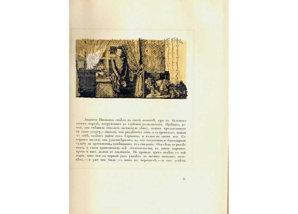 Книга отпечатана на высококачественной вержированной бумаге ручной выделки. Издание оформлено выдающимся художником-акварелистом, талантливым искусствоведом Александром Николаевичем Бенуа (1870-1960), создателем и вдохновителем знаменитого художественного объединения «Мир искусства». Большое значение в формировании художественных представлений А.Бенуа имела страсть к театру и жанру драмы, одним из ярчайших выражений которой стали постановки «Пиковой дамы» А.С.Пушкина.