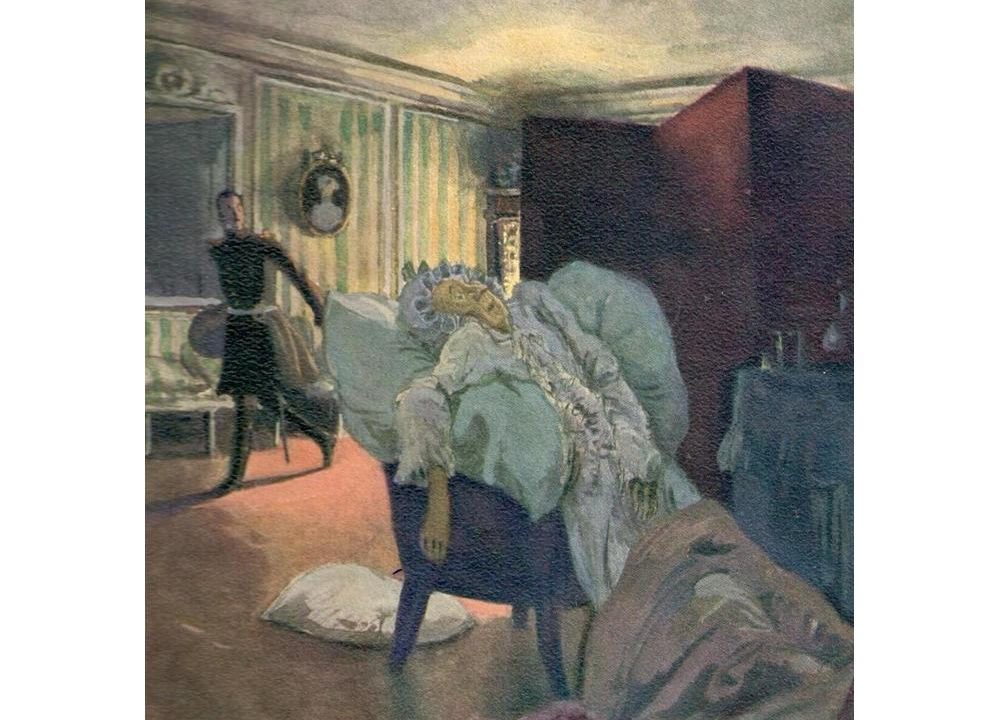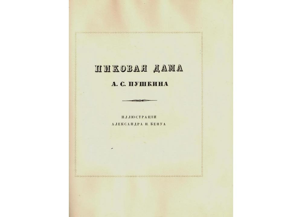 Опыты создания иллюстраций к этой повести А.Бенуа предпринимал еще в 1898 году, а затем в 1905 и 1910 годах создал цельный цикл рисунков. Специфическими чертами иллюстраторского дарования Бенуа были сила его воображения, сюжетная изобретательность, умение передать дух и стиль изображаемой эпохи. Именно в иллюстрациях к «Пиковой даме» более отчетливо, чем в любых других, отражаются искания художника, его попытки создать самостоятельную систему книжного оформления. Макет «Пиковой дамы» тщательно продуман и разработан художником. Полосы текста заключены в орнаментальную рамку, не рисованную, а составленную из Элементов типографского набора и искусно стилизованную в духе изданий пушкинского времени. Каждая глава украшена отдельным шмуцтитулом и имеет одну страничную иллюстрацию, заставку и концовку, выполненные в цвете. Один фронтиспис, семь иллюстраций на отдельных листах и столько же – вклеенных в текст, 13 заставок и концовок, раскрашенных акварелью. Все рисунки сюжетны, и каждый из них выполняет самостоятельную роль в системе иллюстрирования. В иллюстрациях к «Пиковой даме» А.Бенуа отразилось тонкое понимание художником творчества Пушкина и его эпохи, а вместе с тем и обостренное чувство современности.